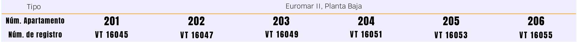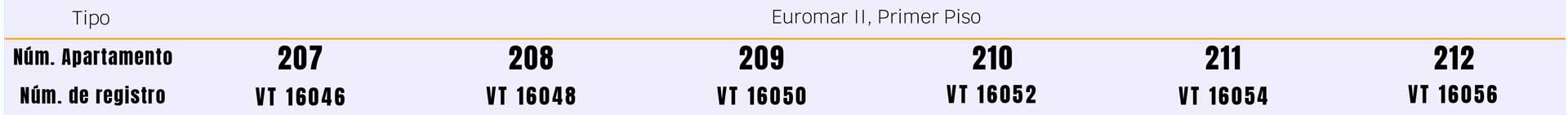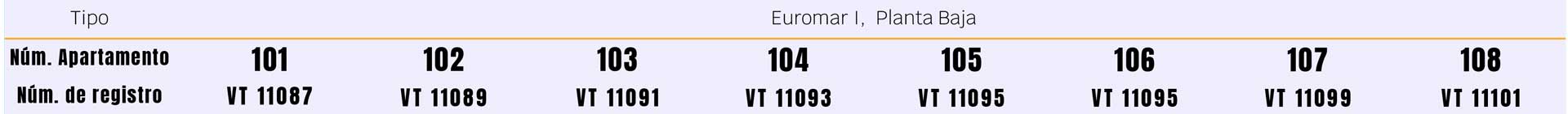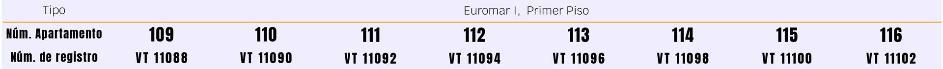 «Euromar I» con 16 viviendas turísticas, 8 en planta baja y 8 en primer piso, todas con terraza, aire acondicionado y servicio gratuito de Wi-Fi. El complejo dispone de una Piscina situada en una zona ajardinada, junto a la recepción.